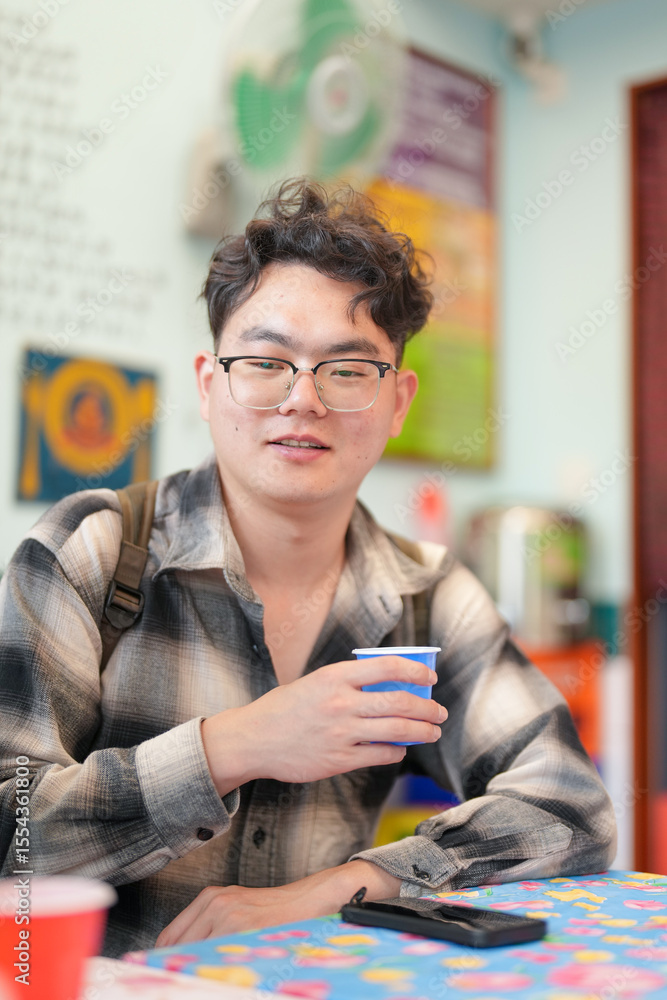 Two Chinese men in their early twenties, both wearing glasses, are casually waiting at a Thai restaurant for their meal to be prepared on a pleasant spring day in Huangpu District, Shanghai, China.