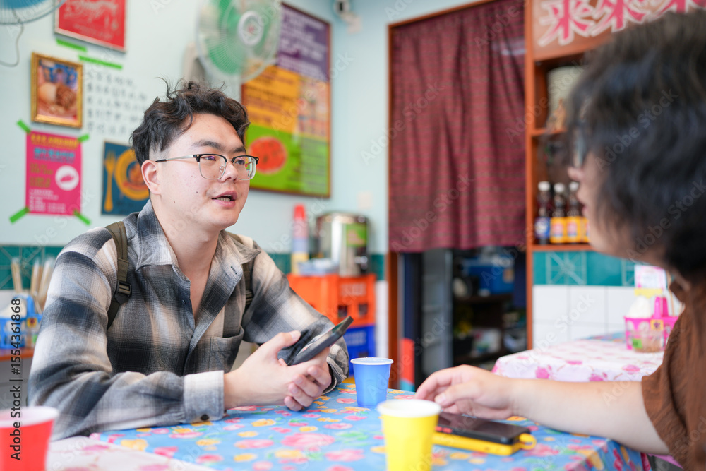 Two Chinese men in their early twenties, both wearing glasses, are casually waiting at a Thai restaurant for their meal to be prepared on a pleasant spring day in Huangpu District, Shanghai, China.