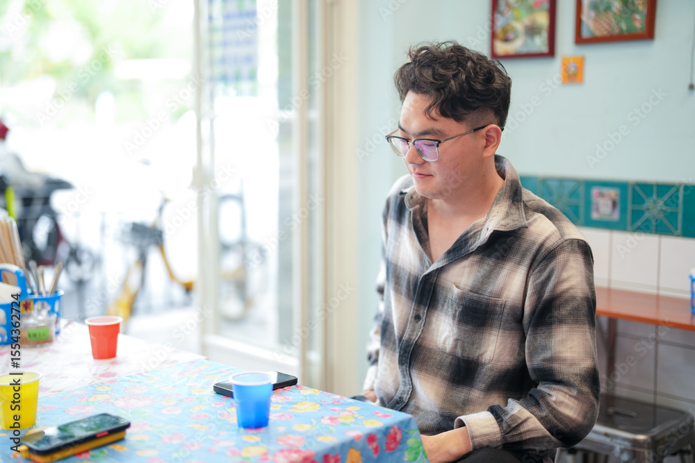 Two Chinese men in their early twenties, both wearing glasses, are casually waiting at a Thai restaurant for their meal to be prepared on a pleasant spring day in Huangpu District, Shanghai, China.