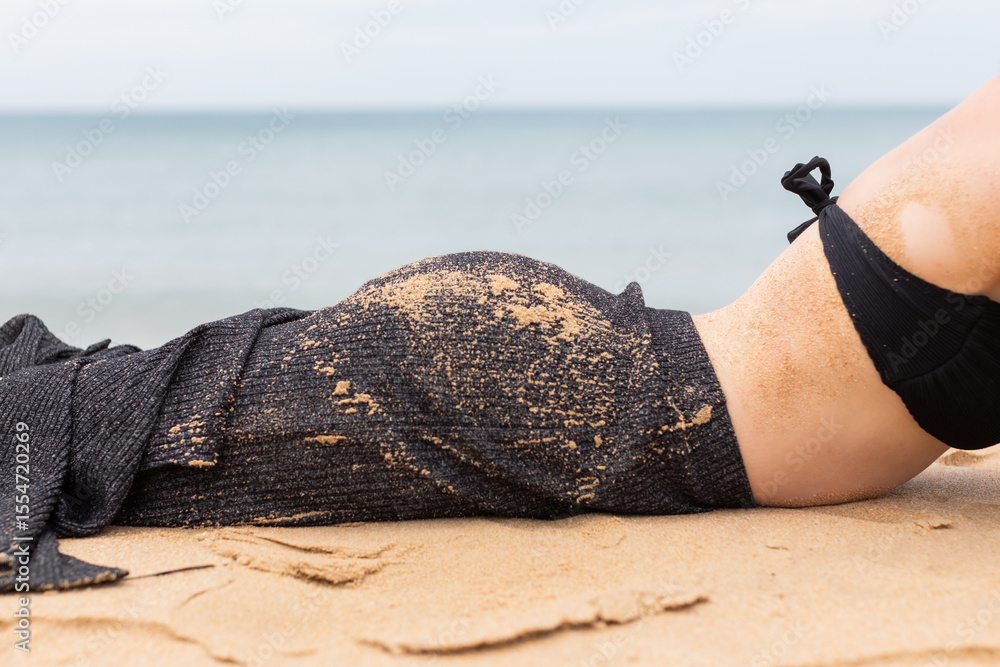 Beautiful young woman relaxing at summer resort, woman smiling on sandy beach, black bikini and skirt, bright sunny tropical atmosphere on islands, island vacation, summer happiness.