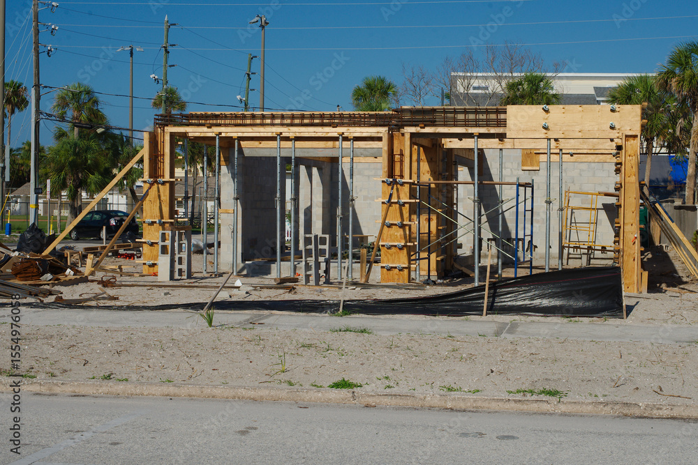 Modern Construction Framework with Wooden Beams and Steel Supports on Sunny Day in Florida. Construction site showcasing modern framework with wooden beams and steel reinforcements, emphasizing struct