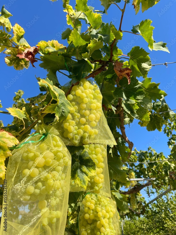 Ripe white grape clusters in protective mesh bags on a vineyard vine under clear blue sky – organic grape farming to prevent pests, birds, and sunburn damage