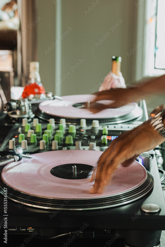 DJ hands scratching pink vinyl records on dual turntables with mixer knobs in a modern home studio setting