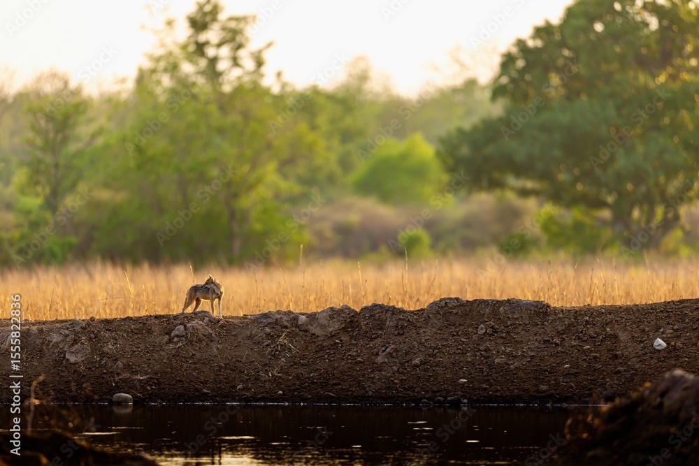 A lone jackal approaches a waterhole in Jim Corbett National Park, India. Alert and cautious, the wild animal displays natural survival instincts in its forest habitat.