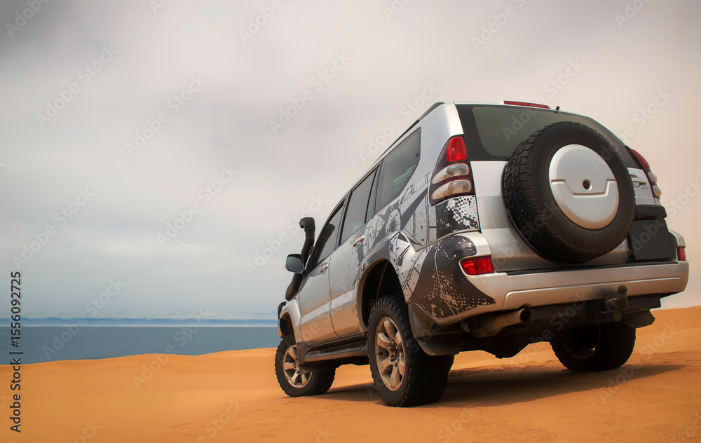 A powerful gray 4x4 SUV stands alone in the vast sandy terrain of the Namib Desert, ready for off-road travel, exploration, and endurance across one of Africa’s wildest landscapes.