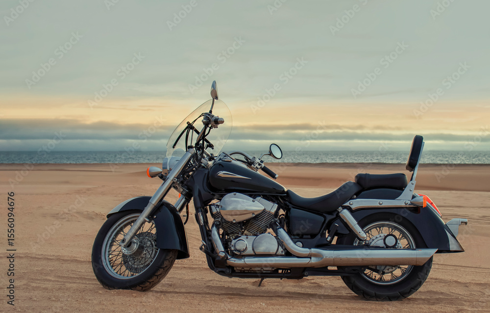 Adventure motorcycle in the Namib Desert – premium stock photo capturing off-road freedom, solitude, and the raw beauty of desert exploration and untamed travel.