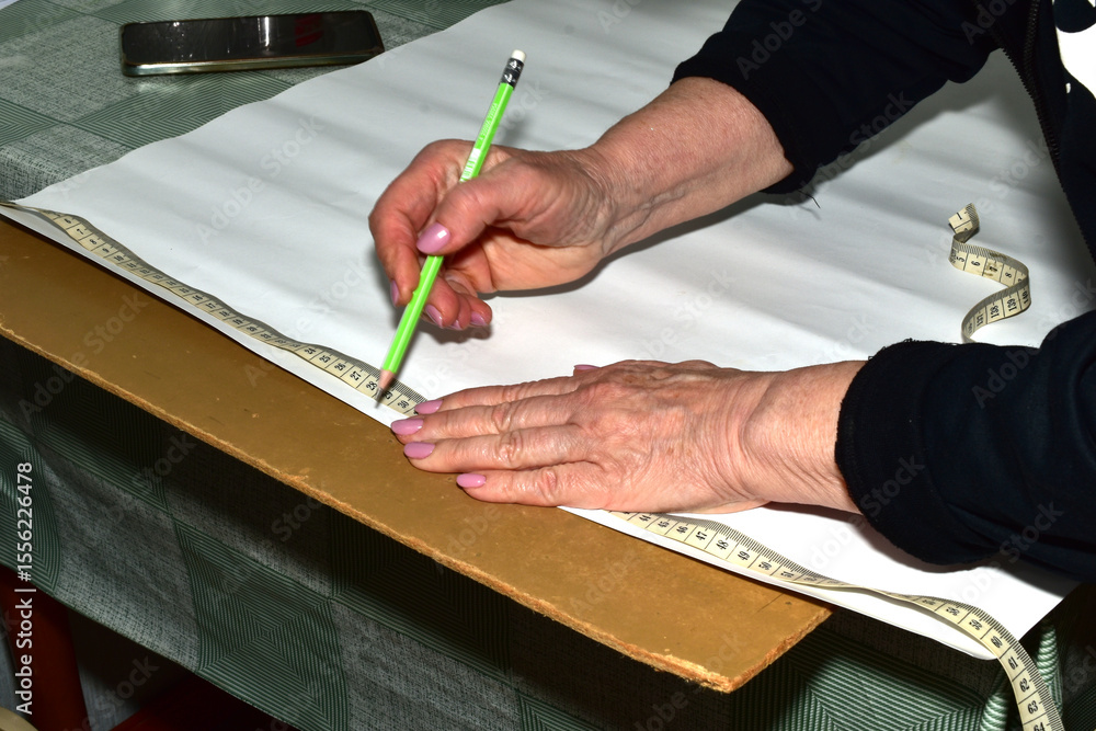 The moment when a cutter creates patterns for sewing clothes. The clothes designer applies markings to a sheet of paper using a ruler and pencil.