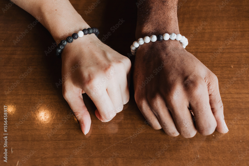 Top-down view of two hands wearing matching black and white lava bead couple bracelets on wooden tabletop in casual lifestyle scene