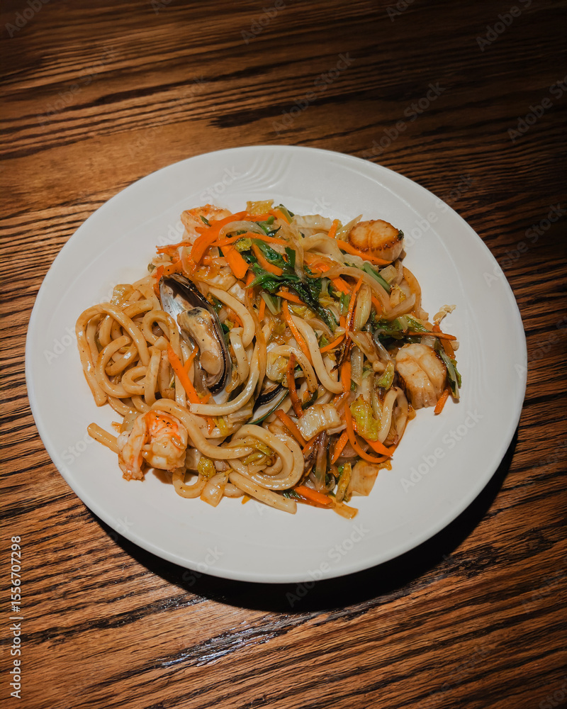 Overhead view of seafood udon stir-fry with shrimp, scallops and mussels on a white plate on a rustic wooden table