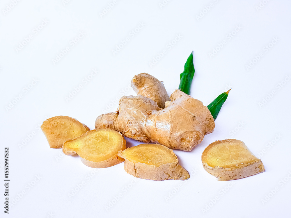 Fresh ginger and sliced ginger isolated on white background
