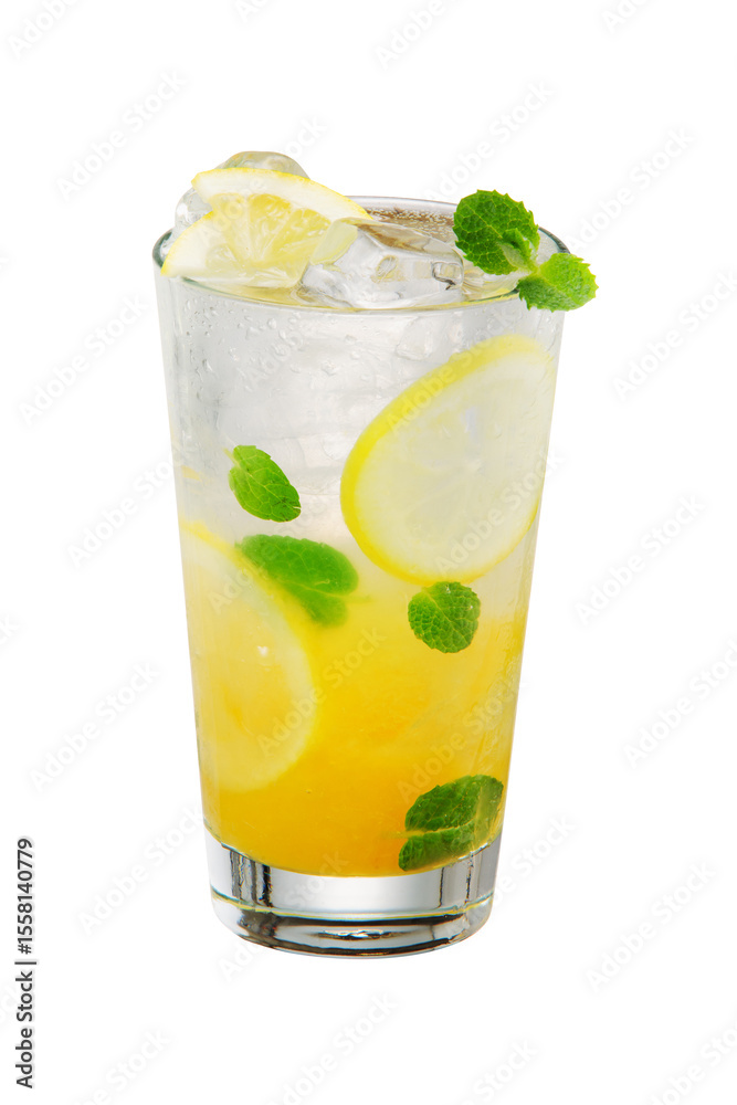 컵에 얼음과 같이 담긴 시원하고 달콤한 레몬에이드.