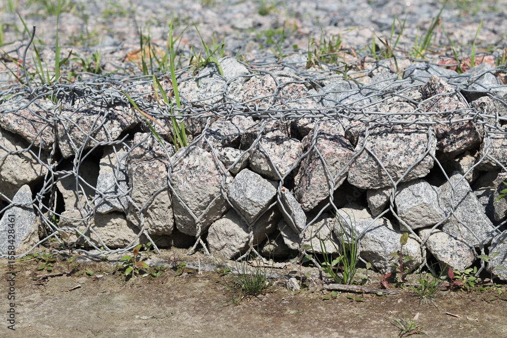 Gabion mattress made of woven mesh with stones for creating paths. Stones in the mesh, creating paths, strengthening. Rubble or crushed stone in a galvanized mesh. Repair in the park