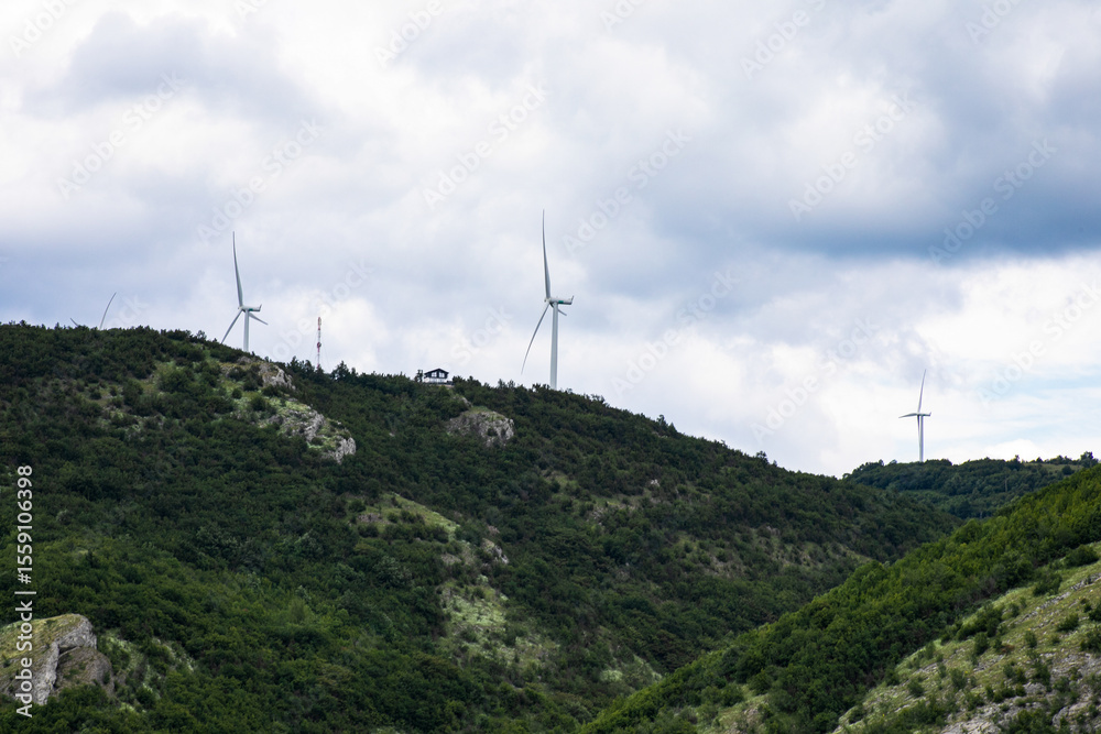 Mystical wind turbines crown verdant hills under brooding skies, invoking Tech Rebellion Day, eco-innovation, sustainable future marvels