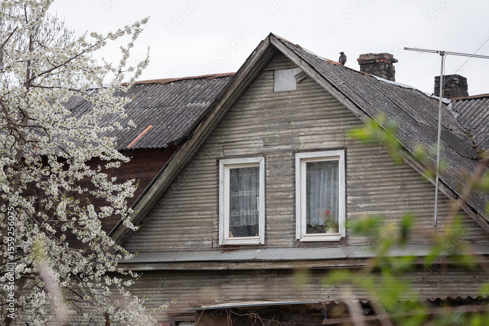 Old weathered house with blooming tree and sky