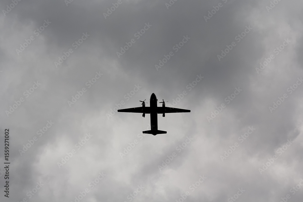 The silhouette of the aircraft against the backdrop of a cloudy sky