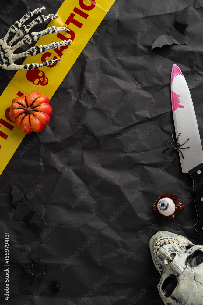 Halloween decorative vertical composition featuring a skeleton, knife, caution tape, and pumpkins on a dark background, perfect for seasonal and horror-themed designs