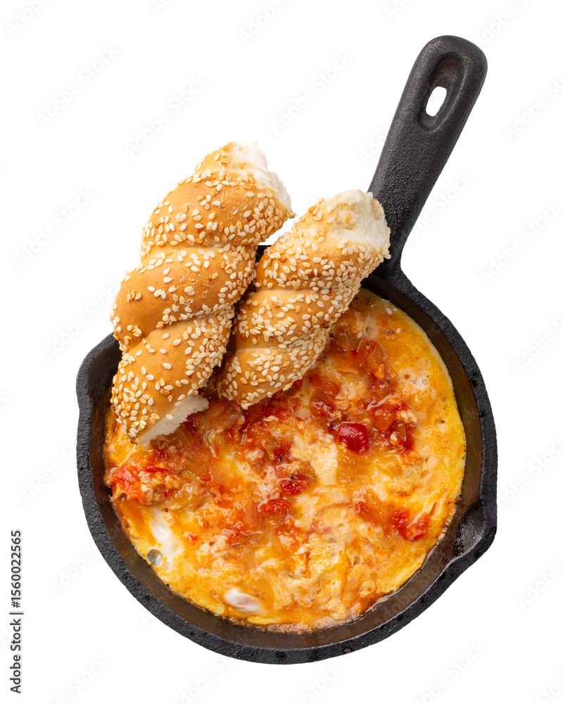 Menemen in small frying pan isolated on white background. Traditional Turkish dish made with eggs, tomato, peppers and spices. Top view..