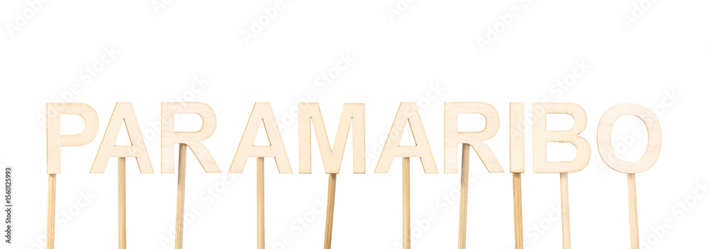 Paramaribo, capital of Suriname, built with thin wooden letters on white background