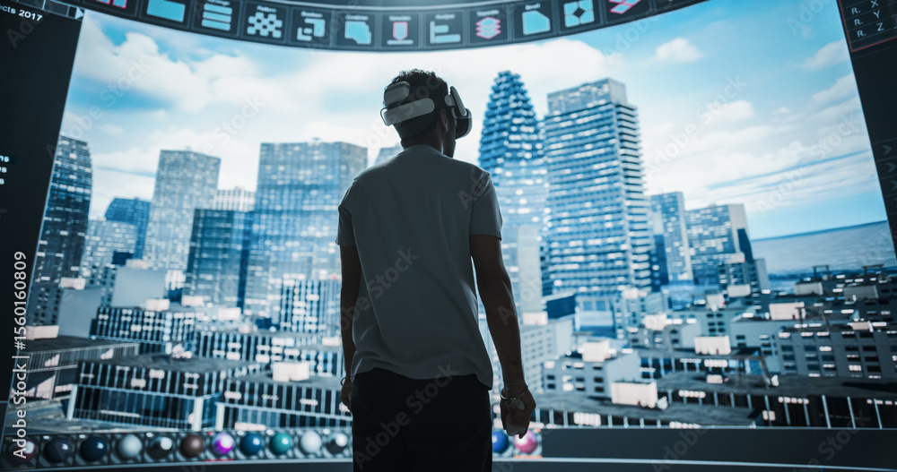 Young Architect Using Virtual Reality Technology, Dynamically Constructs a Digital Cityscape on a Massive Screen in a Dark Studio. Creative Man Wearing a VR Headset and Holding Motion Controllers
