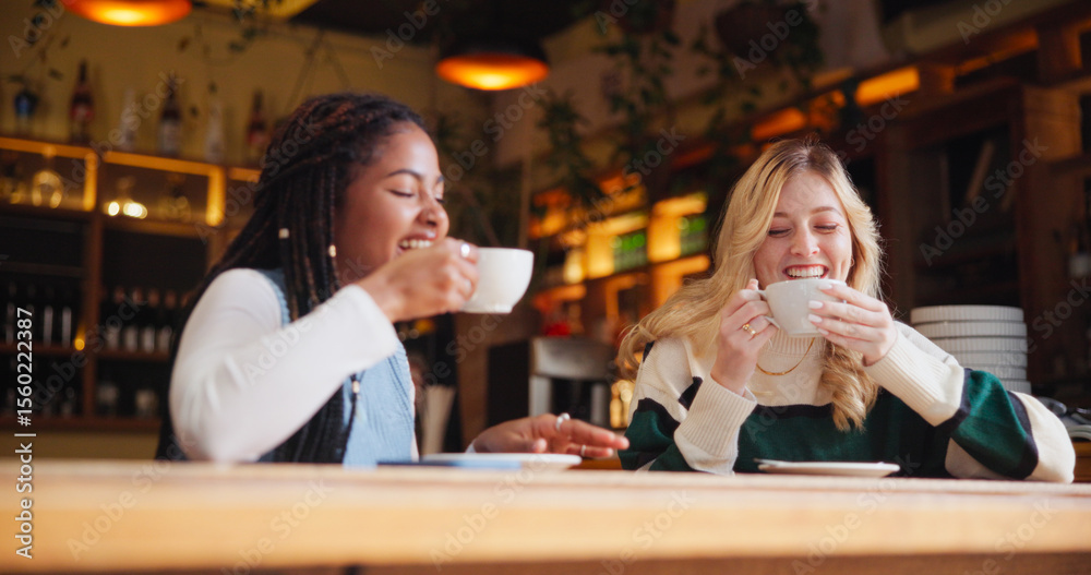 Coffee shop, friends and happy women with drink in conversation for hangout, reunion and bonding. Restaurant, cafe and people with beverage, talking and gossip for relationship, social chat and relax