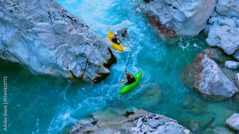 A thrilling aerial view showcases two kayakers navigating a narrow, fast-flowing river between large rocks. One kayaker, wearing a white helmet, paddles a yellow kayak, while the other, in a black.