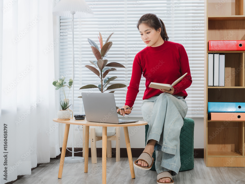 Work-life balance: A focused individual adeptly manages her professional and personal life, engaging with a laptop and reading a book in a harmonious blend of work and leisure in a bright setting.
