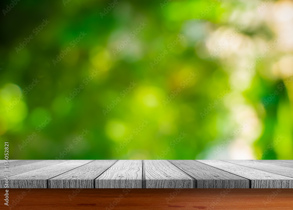wooden tabletop surface with fresh green nature background
