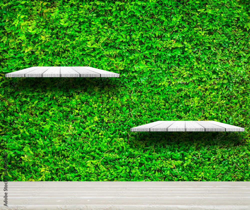 shelves with fresh green small plants and brick background use for products or something display.