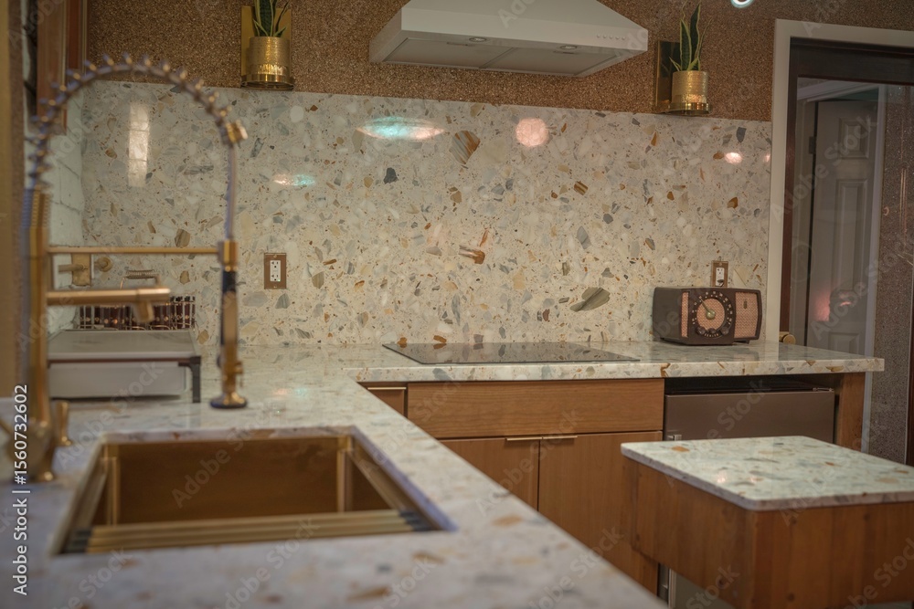 Stylish mid-century kitchen with terrazzo countertops, brass fixtures, and a retro clock radio. Warm wood cabinetry and metallic details create a timeless aesthetic.