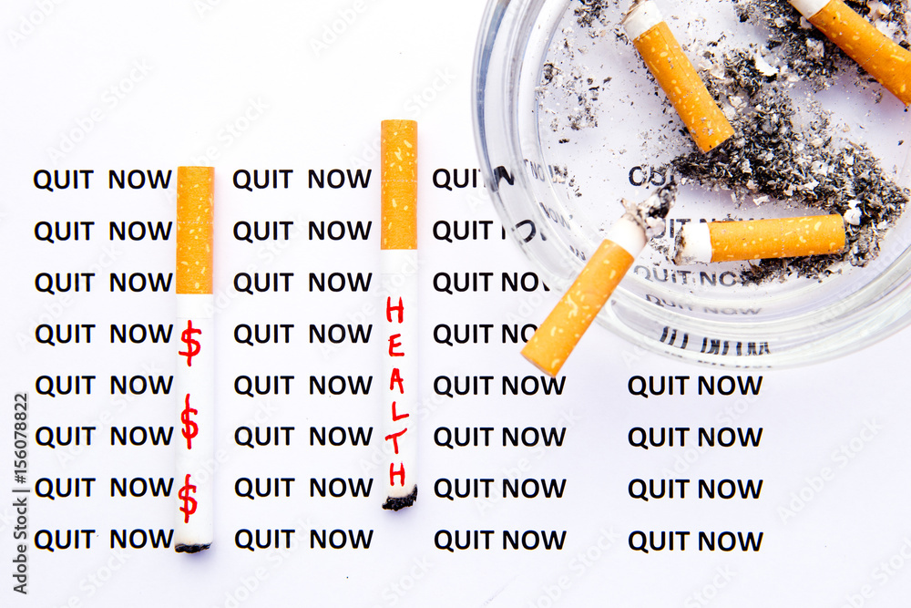 Stop Smoking - Quit Now - with cigarettes and ashtray on printed background