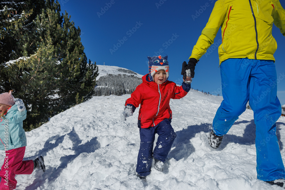 Kids and adult jump joyfully on a snowy mound under blue sky