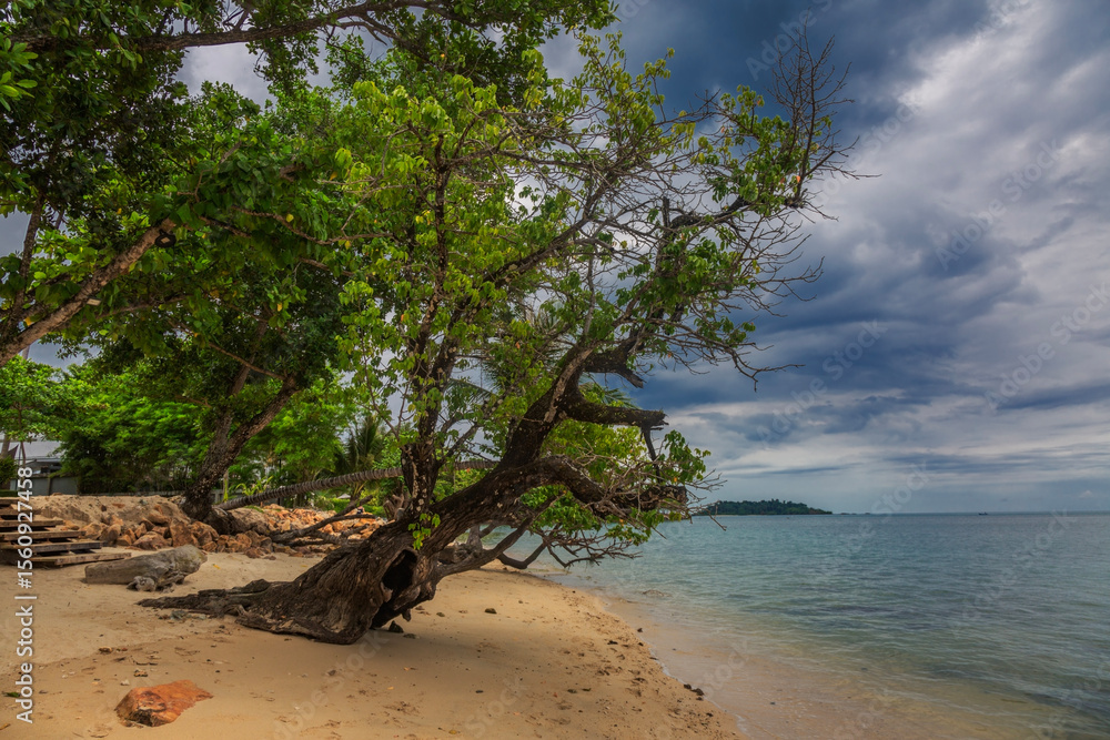 Trees on Kai Bae Beach under a gloomy dramatic sky