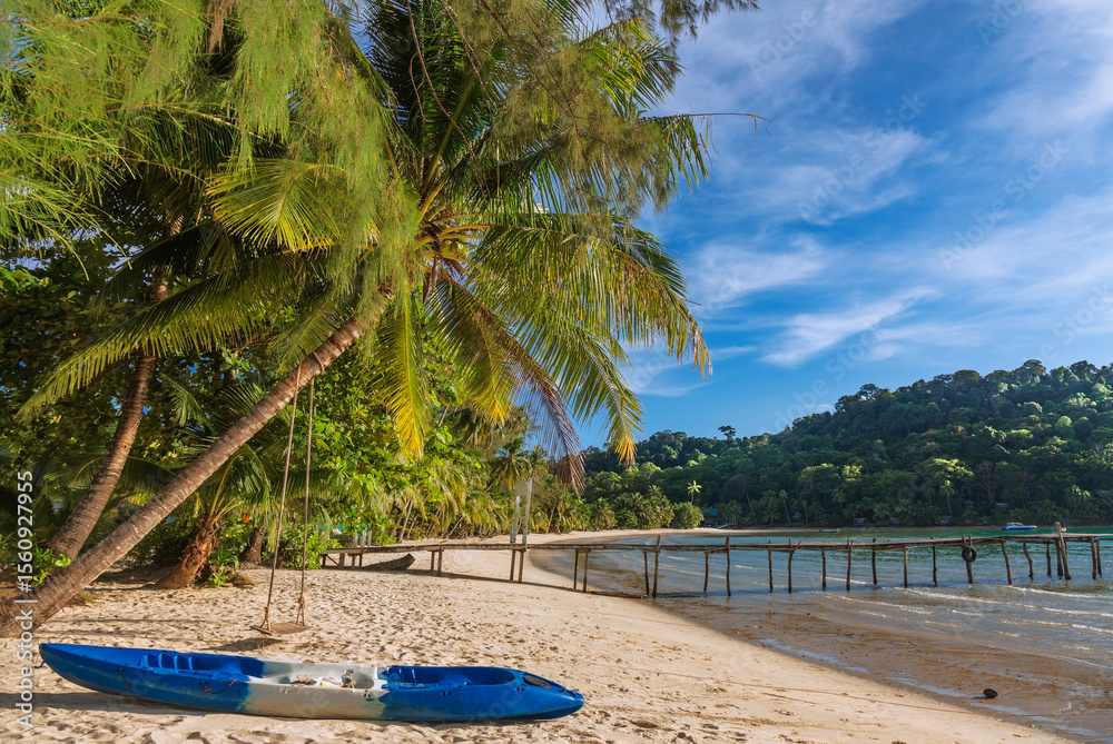 Beautiful landscape with kayak and palm trees and low tide sea at Bang Bao Bay, Koh Kood island