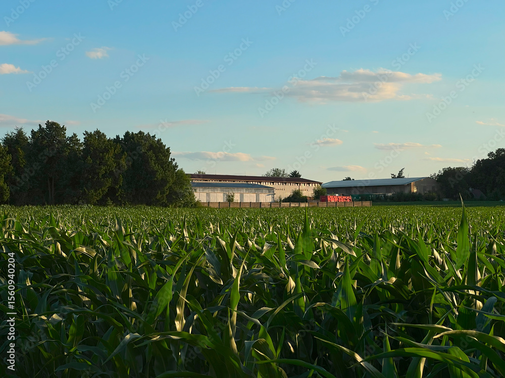 Early evening corn field in the Czech Republic, farmhouse in the background.