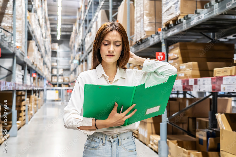 Large storage facility, Young woman diligently checking her clipboard as she organizes and oversees the supplies, but she forgot detail, feeling stressed, mistake while Exploring the warehouse