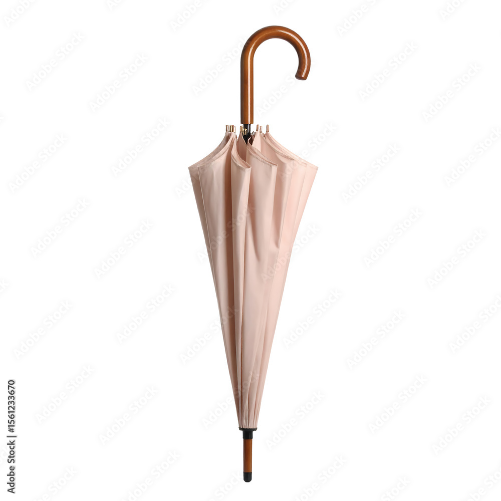 Elegant closed pink umbrella on white background still life minimalist style