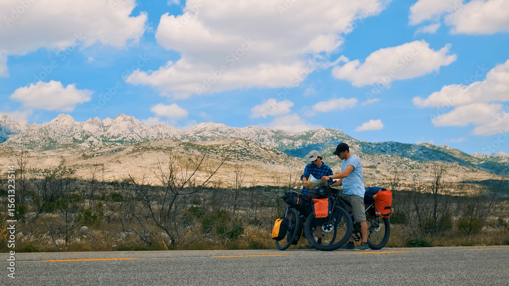 Two men, one of whom is likely Caucasian, are on a bike touring adventure. They stop on a scenic road, surrounded by mountains and clouds, to consult a map.