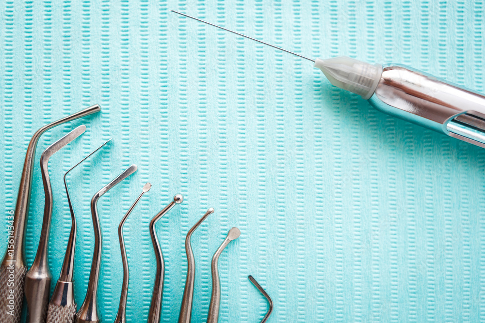 dental instruments on blue napkin. Top view with copy space for text.