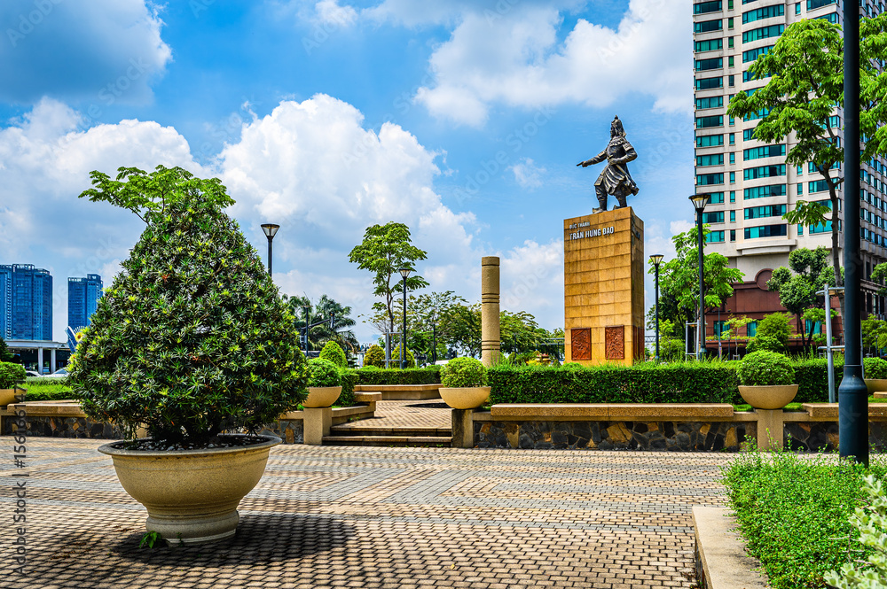 Scenery of Me Linh Park with the statue of 13th century general and national hero Tran Hung Dao in the center of Ho Chi Minh City, Vietnam.