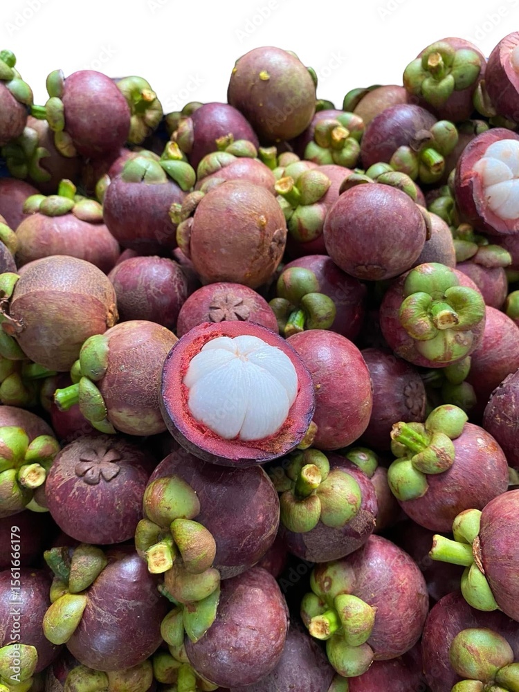 A fresh mangosteen cut in half showing juicy white flesh and thick purple rind. Known as the Queen of Fruits, with a sweet and tangy taste. Isolated on white background.