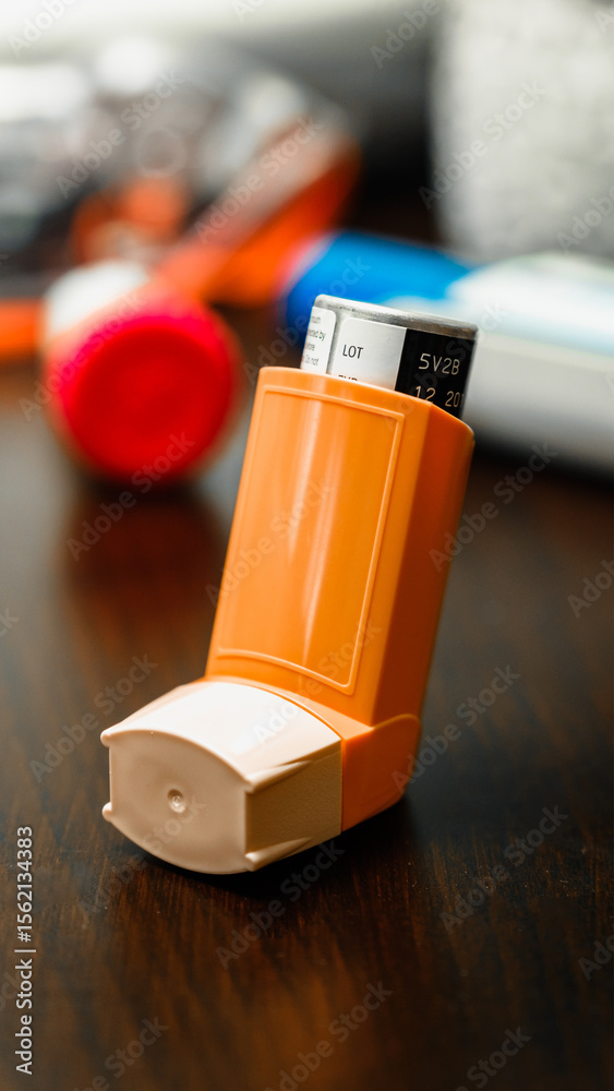 Orange Asthma Inhaler Standing on Wooden Table with Blurred Background