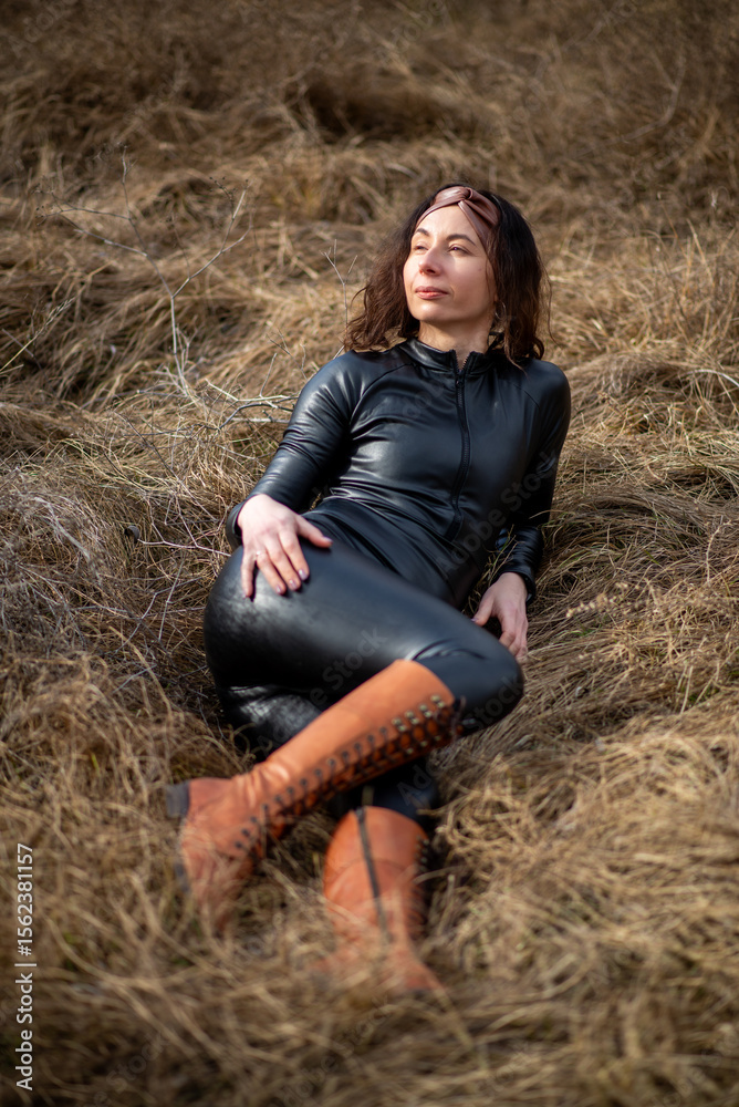 Girl in a field wearing a leather jumpsuit. Catsuit