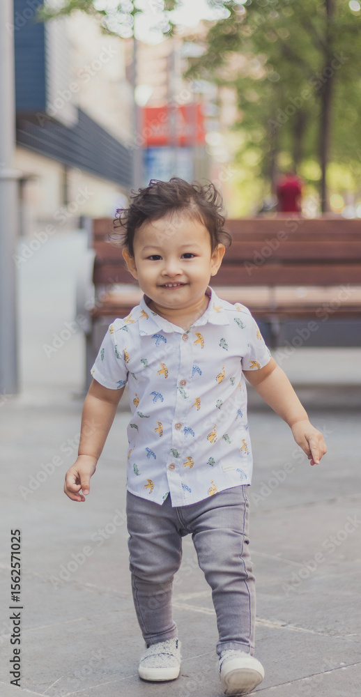 Happy toddler running joyfully in a sunny urban park, showcasing childhood innocence and exuberance