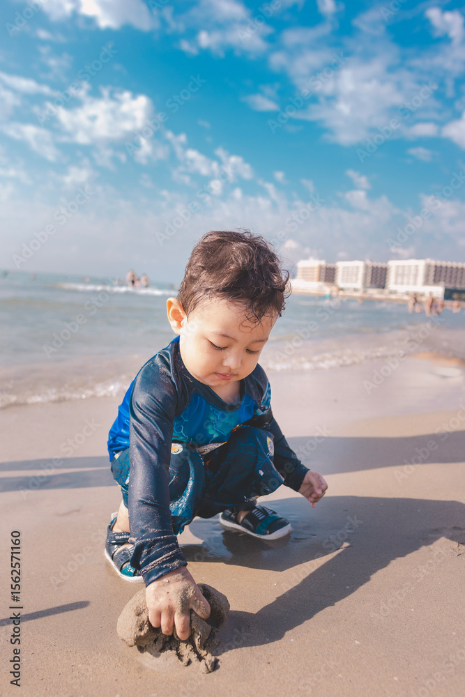 Young child playing joyfully on the beach under a sunny sky, exploring the sandy shore