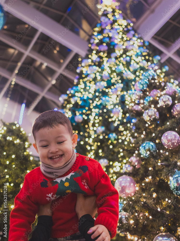 Joyful child enjoying the festive atmosphere in front of a Christmas tree filled with lights
