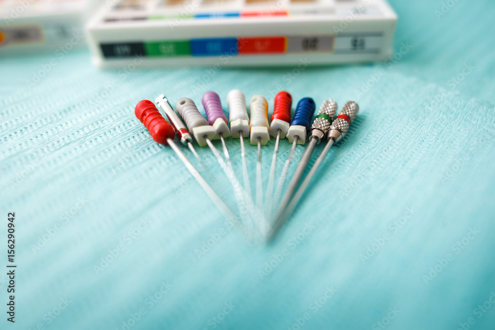 endodontic instruments on the napkin. Top view with copy space for text