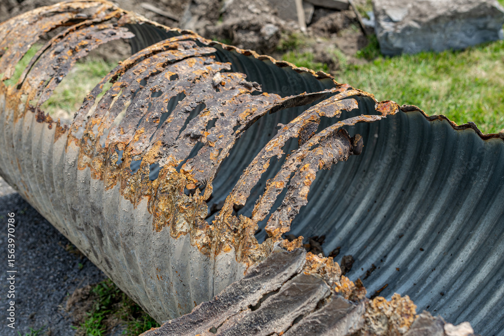 Infrastructure photo of rusted out corrugated metal pipe, CMP, drainage culvert, that has been removed from the ground and being replaced with a new pipe.