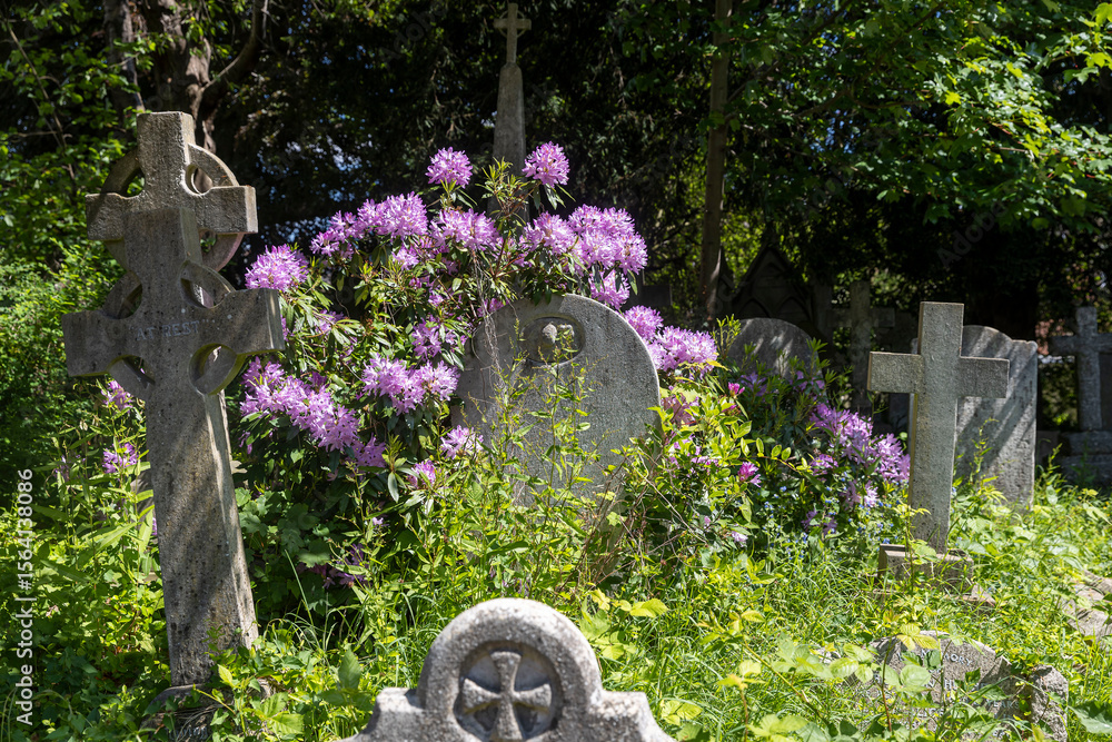 London, UK, 7 May 2025, Old, moss-covered Celtic crosses and rounded gravestones are vibrant with purple rhododendron flowers and tall green grass in an overgrown cemetery