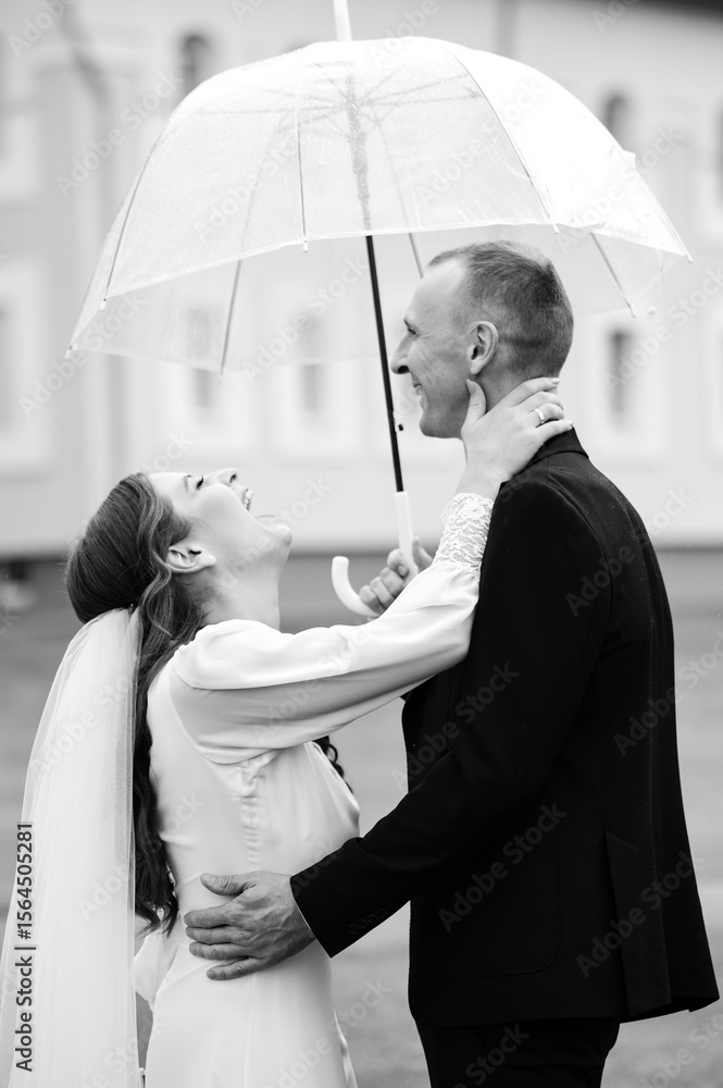 A happy couple shares a tender moment under a transparent umbrella on their wedding day.
