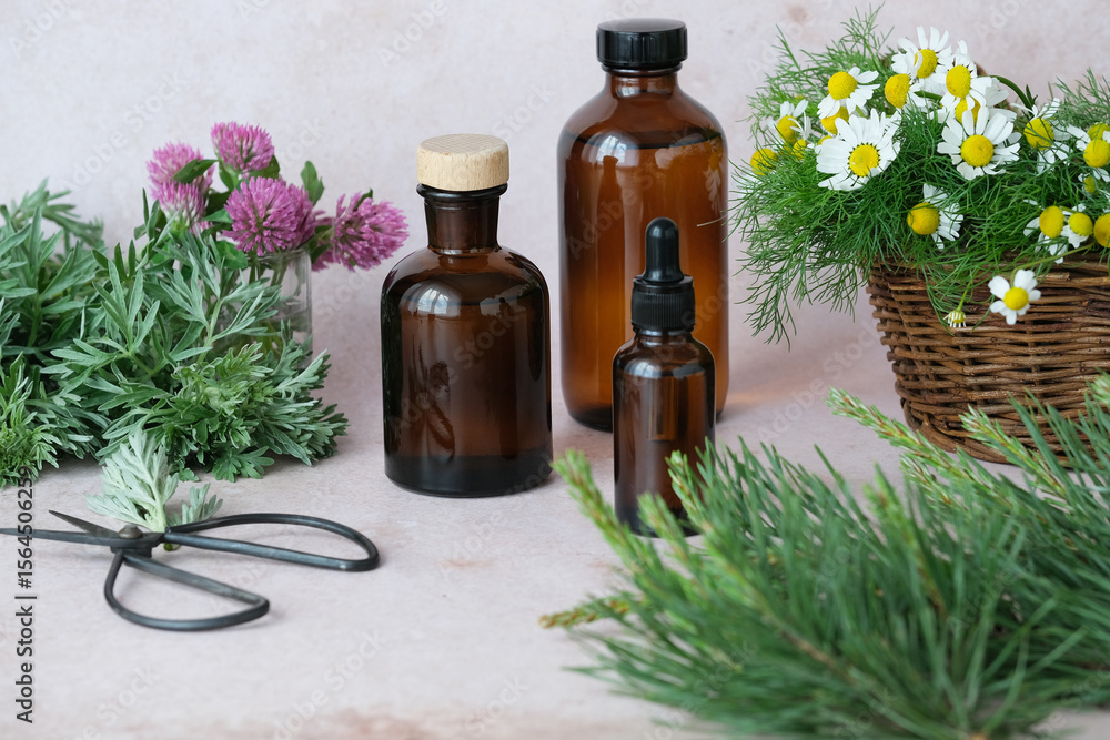 Three dark glass bottles containing essential oils arranged with vibrant herbs and blooming flowers. Natural aesthetic ideal for herbal remedies. Alternative medicine, healthy and well-being concept